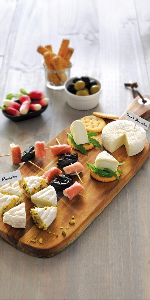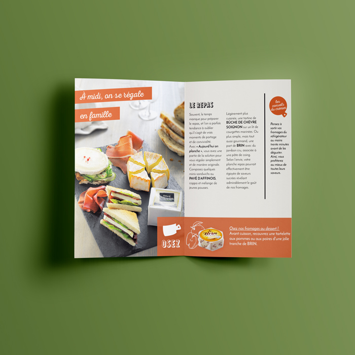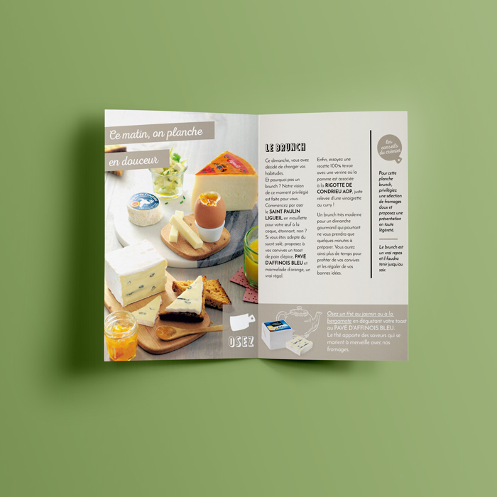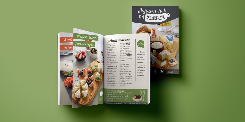 « On va plancher » est une opération conçue de toute pièce par l’agence autour d’instants de consommation festifs et actuels : les planches. Les recettes de cette opération sont des créations de la maison de communication avec pour matière première les fromages de la fromagerie Guilloteau. On a aimé et on a gouté tous les fromages de la fromagerie Guilloteau au cours d’un work shop avant de concevoir cette opération. Nous en avons laissé un peu tout de même pour les magasins.