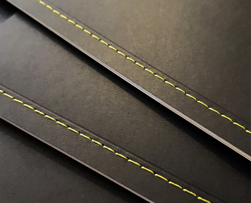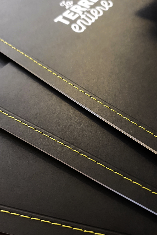 Piqué à l’ancienne, le fil jaune or élégamment associé à la couleur de la vignette au trait de notre projet d’édition apparait puis disparaît dans la chair du papier ganté de noir profond. C’est presque régressif. Voir se faire l’opération derrière la machine, c’est encore mieux nous racontera Sabine.