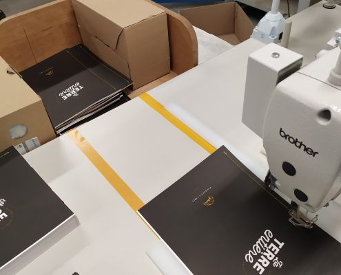 Bon voilà, c’est pas demain la veille qu’on aura une autre occasion de produire une édition avec une piqure singer, l’époque n’est plus vraiment à cela. Mais nous, on s’est fait plaisir avec cette petite coquetterie d’agence. Ah oui, des façonniers qui piquent le papier de la sorte, il n’en reste plus beaucoup en France 2 ou 3 pour ainsi dire. À plus forte raison de promouvoir cette vieille technique traditionnelle qui ne doit pas se perdre dans nos linkedin respectifs. On aime bien aussi le numérique à la terre entière, mais y’a pas, c’est pas pareil.